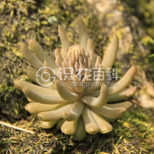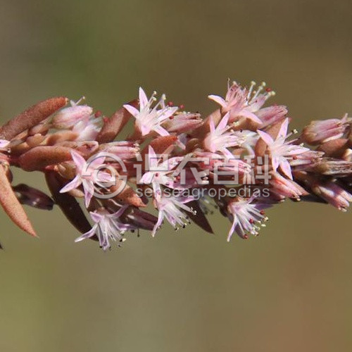 二年生肉质草本。密生紫红色斑点。基生叶莲座状,匙状线形,先端增大,为白色软骨质 ,边缘有流苏状软骨片和1针状尖头;茎生叶线形至倒卵形,先端长尖,开花时基生也枯萎,由茎顶抽花序,多分枝,花小,两性,花瓣5,淡粉红色,有红色斑点。蓇葖果。花期7-9月,果期8-10月